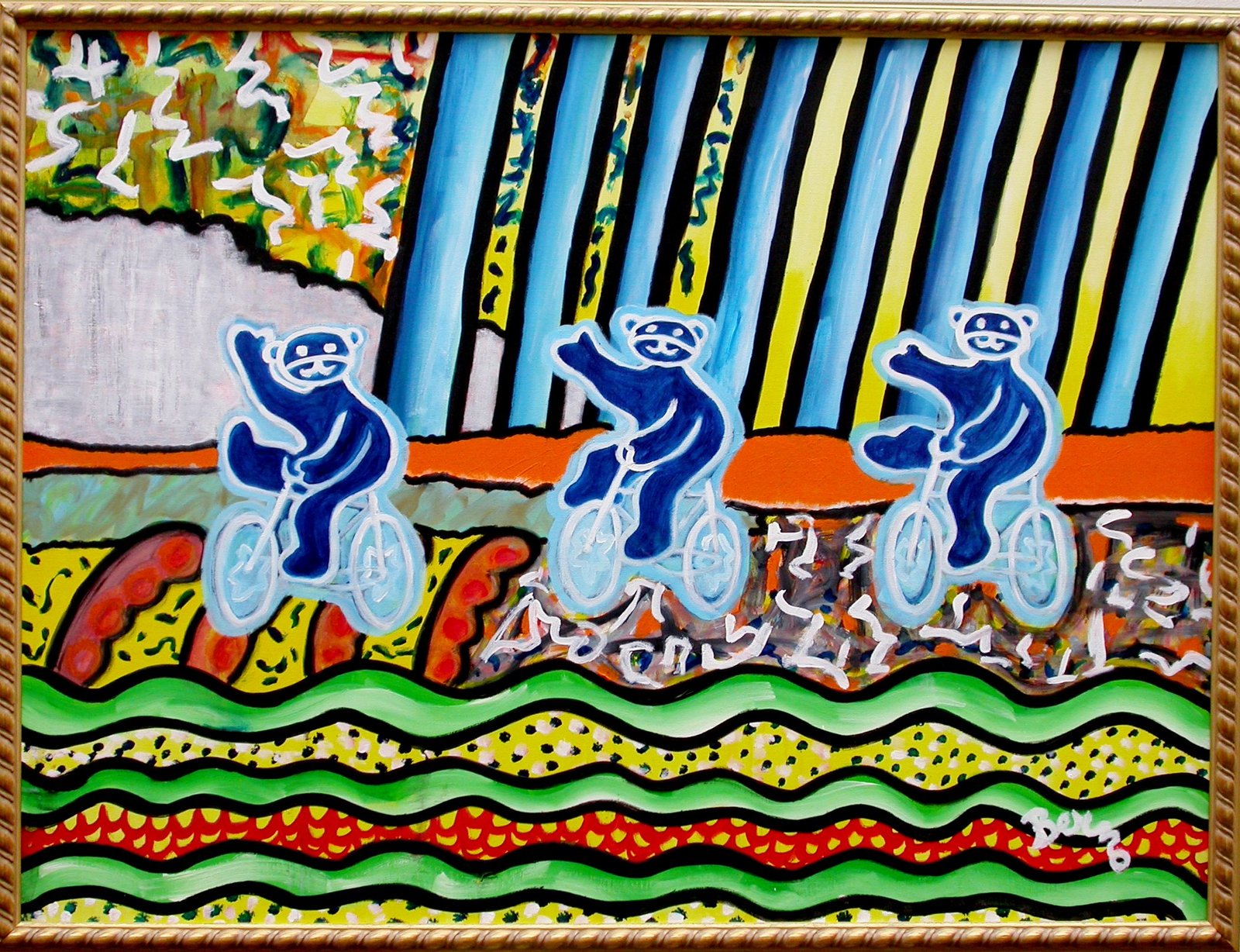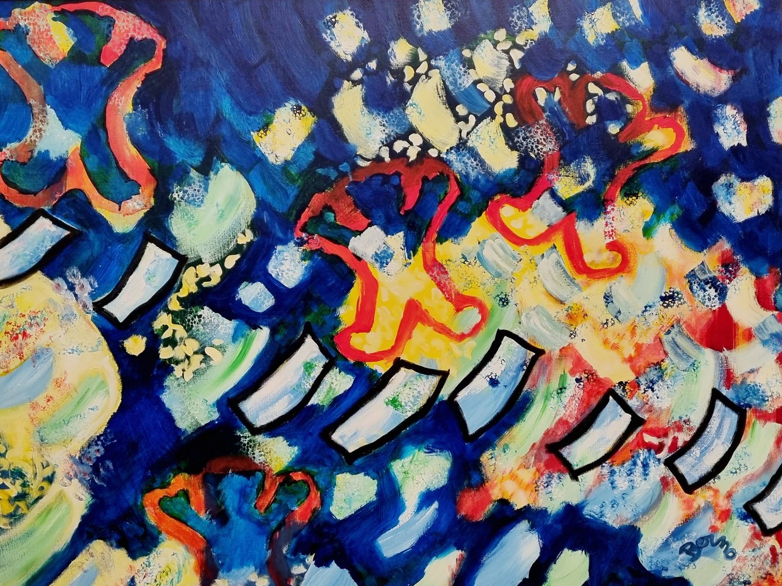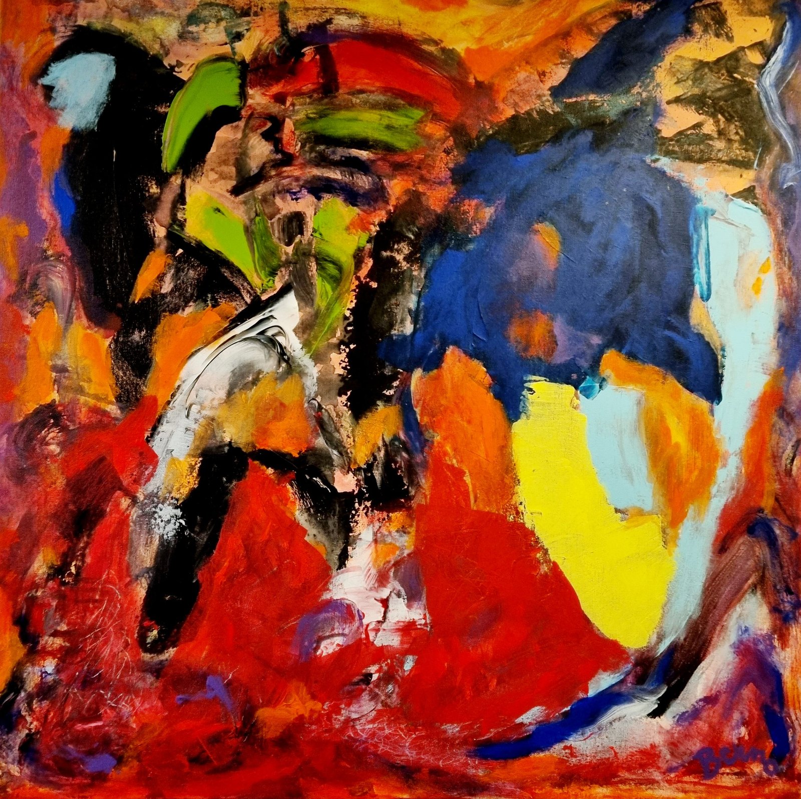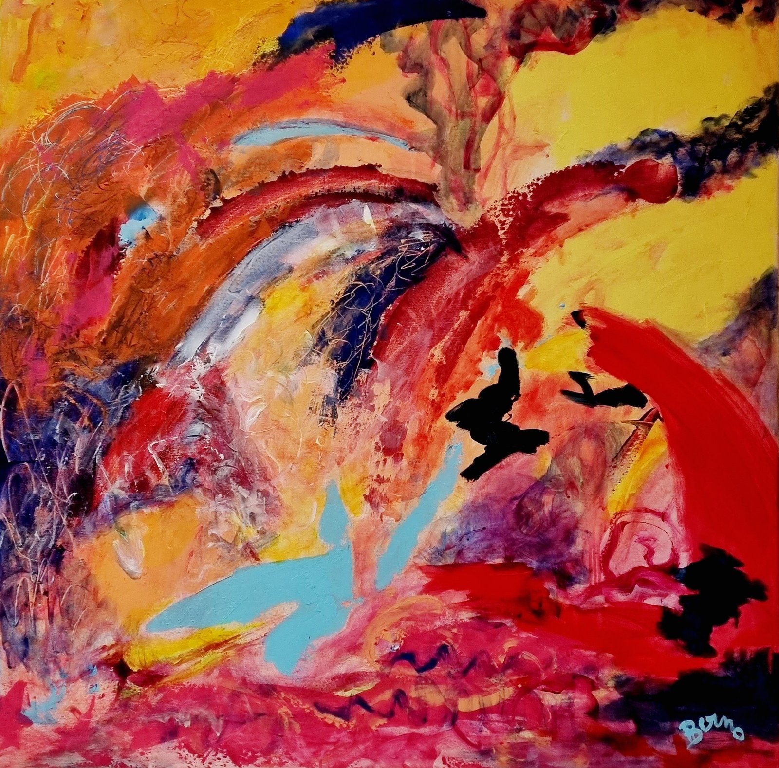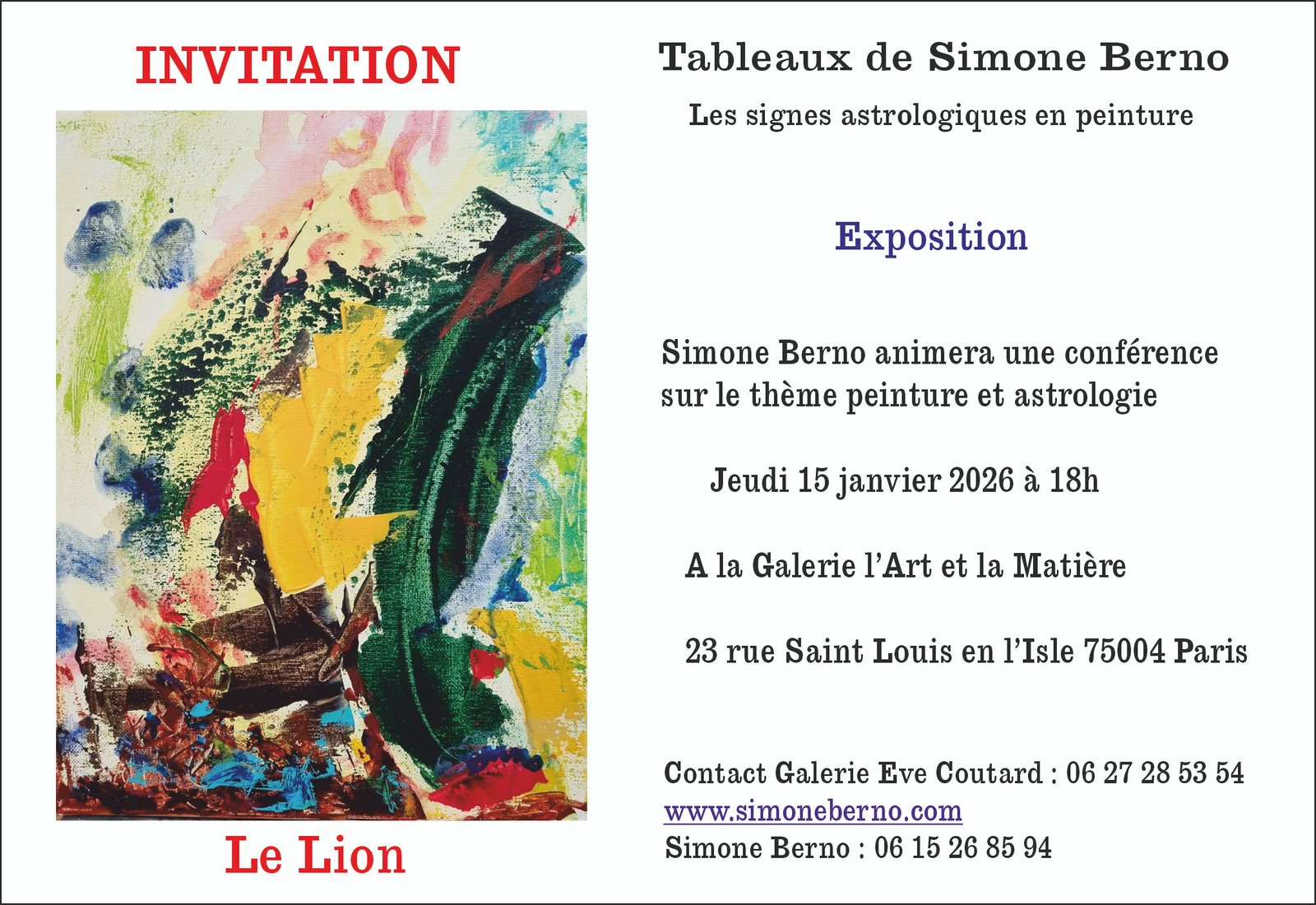 Issue d’une famille d’artistes peintres et sculpteurs, Simone Berno s’est affirmée dans un style très personnel, alliant une démarche contemporaine à la palette colorée pleine de gaité avec une sensibilité faite d’émotions. Sa peinture, proche de l’abstraction lyrique, se joue des formes et des couleurs et entraine le spectateur vers un univers imaginaire où la représentation est secondaire et laisse la place aux sensations et aux sentiments. L’esprit peut vagabonder au travers de ces paysages abstraits en y trouvant, à chaque fois, des choses différentes.
